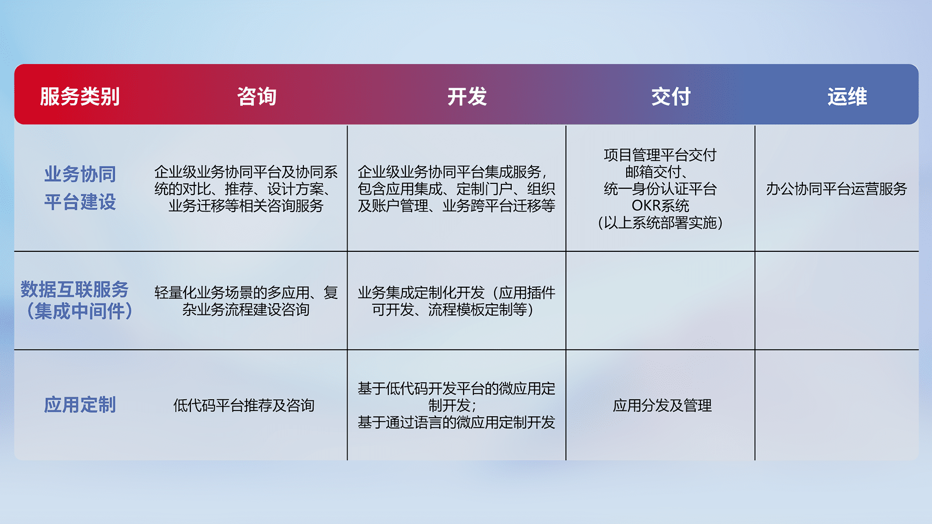 针对钉钉、、企微、、、、IDaas等平台级产品提供产品的规划、、、方案、、交付、、、定制化开发等服务,,实现如统一协同办公、、智能客户服务、、、、混合会议管理、、、智能数据查询、、、等业务场景,,,,实现数字化转型。。