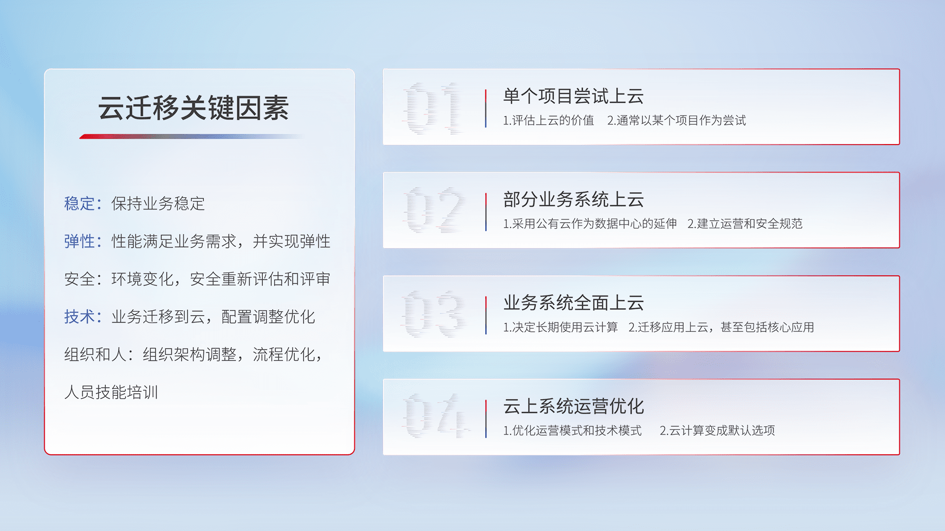 结合实际业务,,,从规划设计、、、云平台选型、、云原生改造、、、、数据迁移、、、、集成交付,,,,迁移全过程为客户识别最佳上云路径,,做好风险识别管理,,,,设计网络架构、、、身份权限、、安全审计合规、、、操作审计、、日志审计、、、、监控告警策略、、多站点容灾设计等,,,对云上基础设施进行整体规划,,,提升IT治理水平,,,,以满足弹性、、、高可用、、高性能的需求。。。。