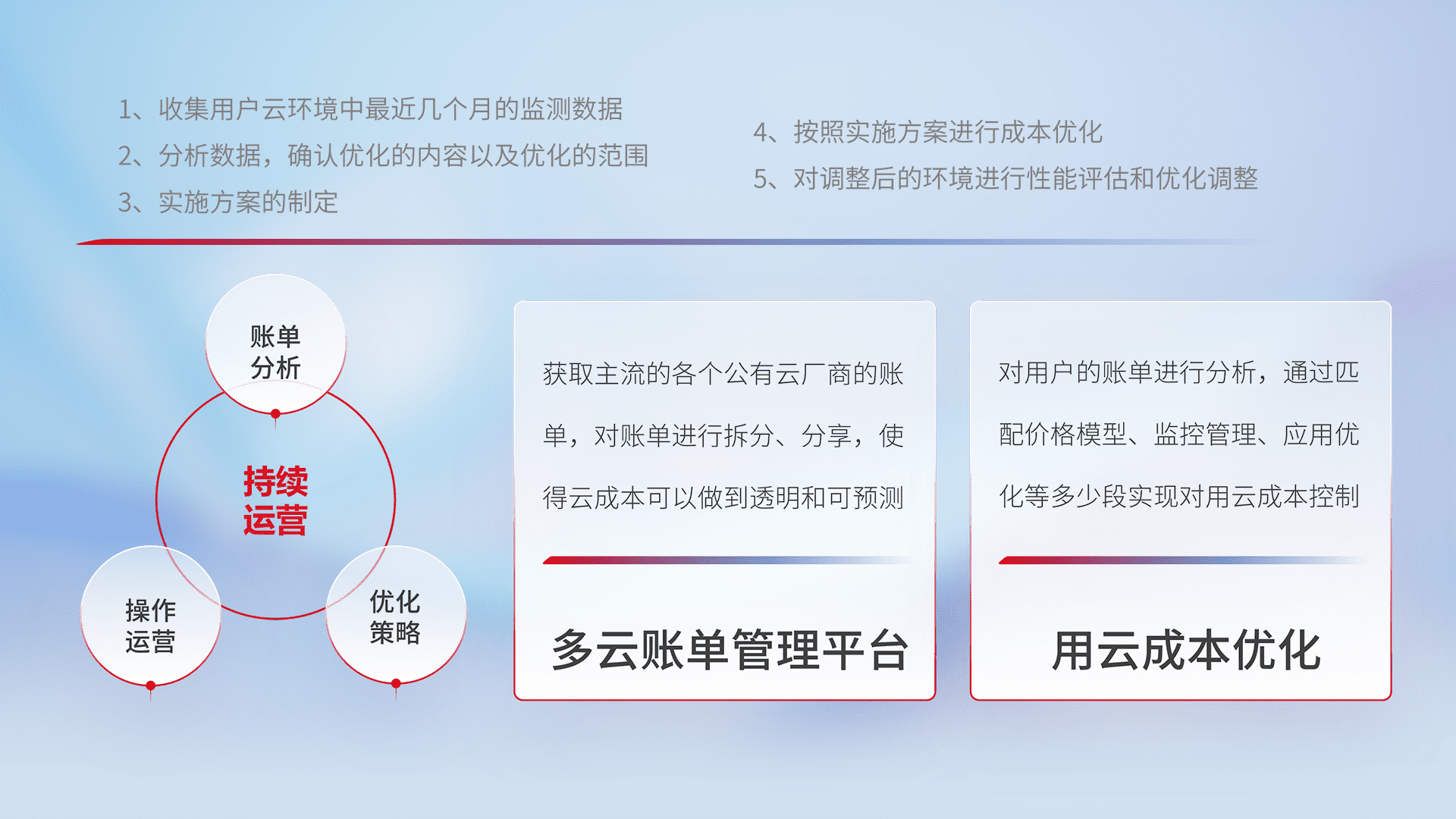 通过多云纳管,,,以统一的资源数据模型把客户的云资源进行抽象和封装,,进而实现对多云资源的统一操作,,保障云资源管理的可靠性、、、、稳定性与可用性。。。量身定制化运维内容,,配置、、、开发运维、、补丁管理、、、、备份、、、、监控、、认证和访问管理、、、、审计和日常巡检等,,保障在用云过程中的可靠度,,稳定度以及高可用率。。